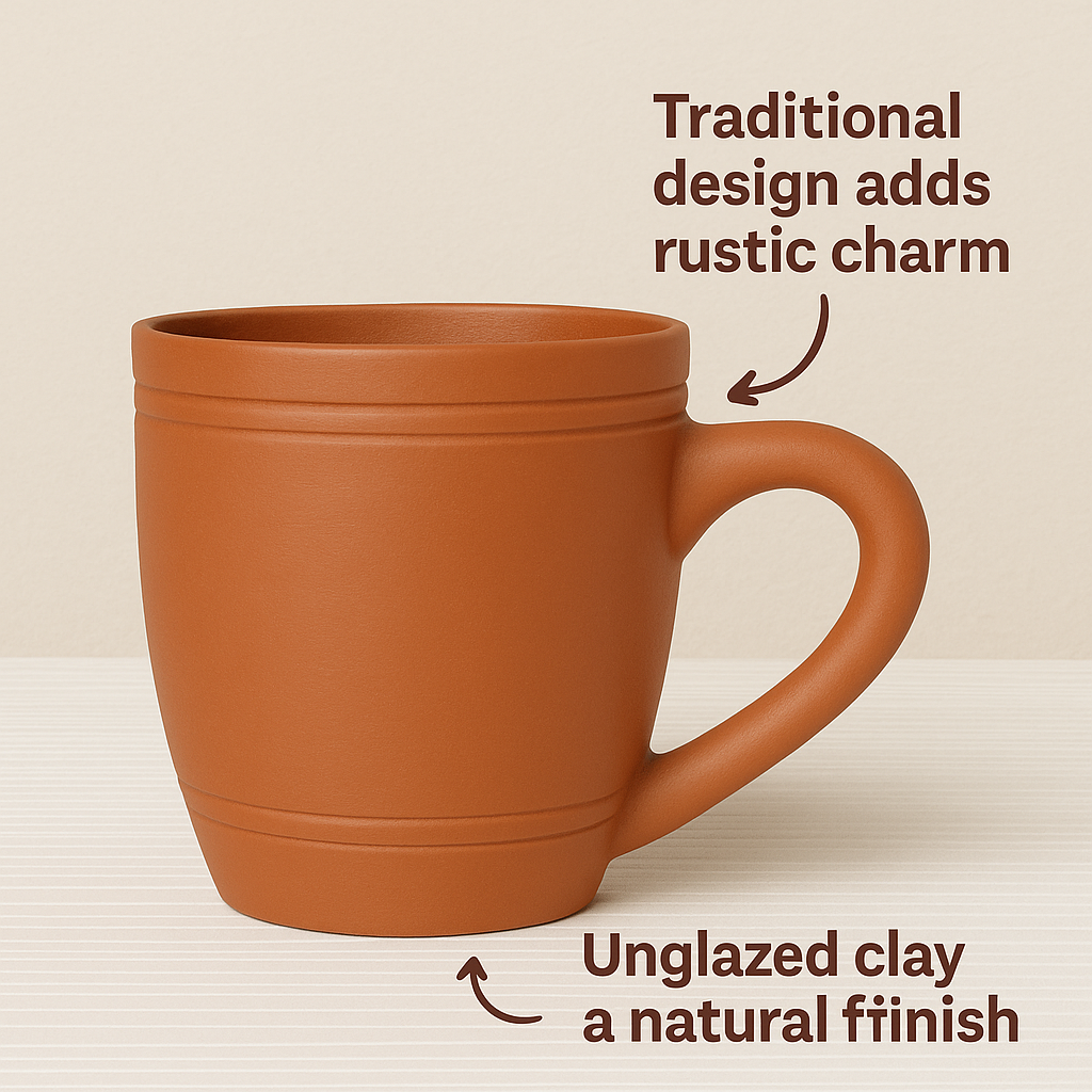 Enjoy your favorite beverages the natural way with our Handcrafted Clay Coffee Mug. Made from pure terracotta mitti, each mug is skillfully shaped by traditional artisans to bring authentic charm and a refreshing drinking experience. The porous nature of clay keeps beverages aromatic and enhances the earthy flavors of tea, coffee, milk, and herbal drinks.